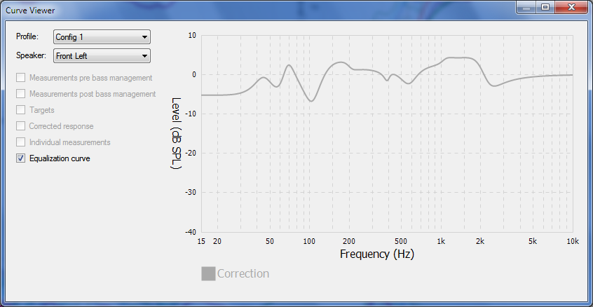 Detail view of ARC-1M Curve Viewer for the MRX-series receivers. This equalization curve is shown above, and is an indication that ARC generates correction that would be difficult to set manually using traditional graphic or parametric equalizers.