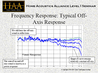 He then showed how to make the off axis measurements of the speaker and how those measurements interacted with the room. The key to all these measurements is to show not just the equipment but how the equipment interacts with the room. I never thought how important the off axis response was until this training. The off axis response is what is reflected from the walls so in measuring it, it is important to look for the same shape curve as you move off axis. That information tells the HAA designer a lot; if the off axis response is poor (dissimilar shape) then some acoustical treatment might be added instead of allowing a direct reflection. The overall goal of these measurements is to eliminate all of the peaks and dips in the response to provide the smoothest possible response curve relative to the seating positions and to achieve the TFR mentioned above.