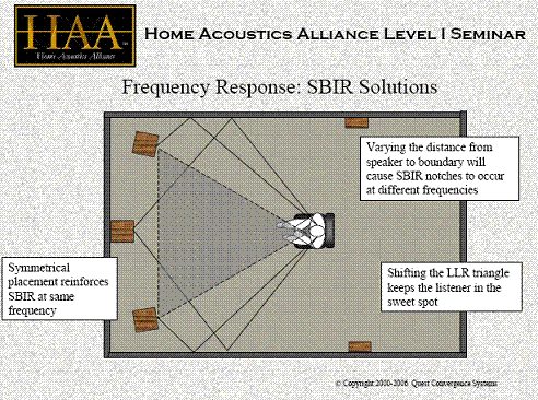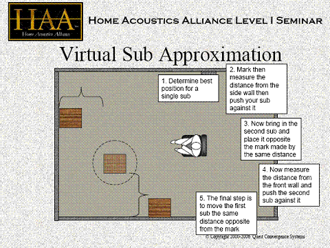 He also showed a couple of other schools of thought for sub woofer placement. Two subs in the middle of opposing walls or four subs, one in each corner.