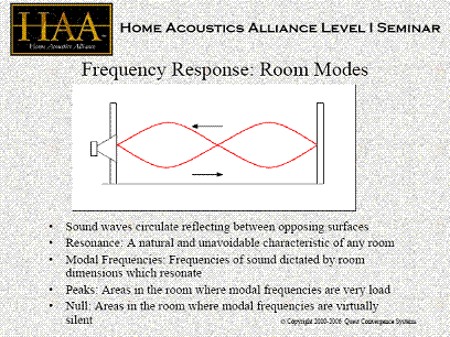 The next topic was the very low frequencies otherwise known as "Room Modes". Room Modes are basically the resonant frequencies between two boundaries which cause peaks and nulls at different places in the room. Room modes are also known as standing waves. I recently saw an ad for a subwoofer that claims it can eliminate standing waves. The only way to accomplish that is to eliminate the room. It seems that snake oil is starting to run down the esoteric cables into the speaker industry. I hope all of you at some point have walked into the corner of your room and heard the increased bass response; that's one of the peaks. In the training we calculated some of the modes from the formula given and then we played the sub at the calculated frequency. We walked around the room identifying the peaks and nulls. It was really cool to see the calculations at work but of course that's what experiments are for. Room Modes get very complex with all the reflections within a room but they are predictable in a rectangular room which is one reason why odd shaped rooms are harder to deal with acoustically. Once we understood room modes we learned how to apply them. Like me, you have probably read several articles on sub woofer placement and realize that there are several suggestions on where to place the sub. The HAA training explained the reasons of where to put the sub in relation to the room modes. What was really great was the tool used to determine sub woofer placement. It was a graphical tool that showed and let the user drag the seating position and the sub to different places in the room after the room dimensions were entered. It also showed the room modes relative to the seating position so as the seat or sub was moved we saw how the room modes were changed. On top of all of this was a small window that showed the low frequency response curve so we could see how the peaks and dips changed as the sub or seat was moved.