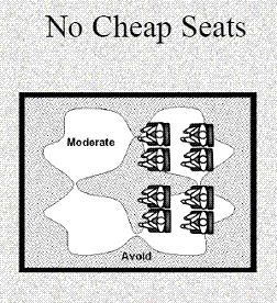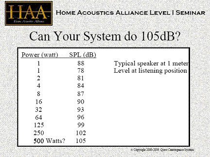 The course started off with an explanation of Sound Quality Management (SQM). SQM is basically starting a theater project from the construction phase and taking it all the way to final room treatments and measurements. SQM also includes an explanation and education for home theater owners so that they can understand the benefit of a properly calibrated room. One of the key factors we learned was eliminating listener fatigue and my favorite quote from the course was "take away the pain so they can turn up the gain." After a discussion about distortion and listener fatigue the definition of sound quality was explained. Sound Quality includes clarity, focus, envelopment, response and dynamics. One sonic quality that many designers overlook is seating arrangement. Gerry's approach is to for all the seats to have good sound, not just the "money seat." His view is that everyone in the theater should have a good movie/music experience and we agree. That doesn't mean that every seat is perfect, but you should strive to have a smooth system response for all the seats so everyone can enjoy the experience. Next he touched on the importance of dynamics and its association with a quit room. It was fun to see how Gerry showed that Home Theater Nirvana would be achieved with a 500 Watt per channel system. The following two slides are a little out of context here but it was used to get a point across about dynamic range.