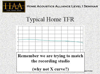 Next Gerry focused on frequency response and its major role in the calibration of the room. I was surprised to learn that a perfectly flat response is not the ideal response. A better response, referred to as the Target Frequency Response (TFR), is slightly boosted in the low frequencies and then slightly tapered off in the higher frequencies which are due to the way the music and movies are mixed.