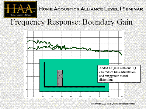 Equalization was then introduced for taking low frequency peaks out of the room response. I was never big on equalization myself but I have tried to have an open mind. In the old days an equalizer usually covered a band of frequencies and when you tried to fix one problem you usually created another. Nowadays with Digital Signal Processing you can correct a single frequency and if you look at the specs of the QSC DSP-4 it is pretty good. He pointed out that you can't EQ out a room null because it is a cancellation and if you try to boost a frequency there, it too will be cancelled resulting in loss of amplifier headroom and possible distress to the subwoofer driver.