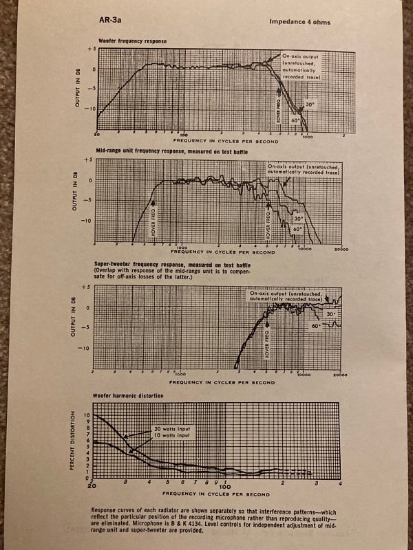 AR technical FR and THD data from 1971. AR published comprehensive, unretouched curves and graphs that no other speaker company of that time period had the nerve to do. Even today, you don’t get this kind of data from the manufacturer.