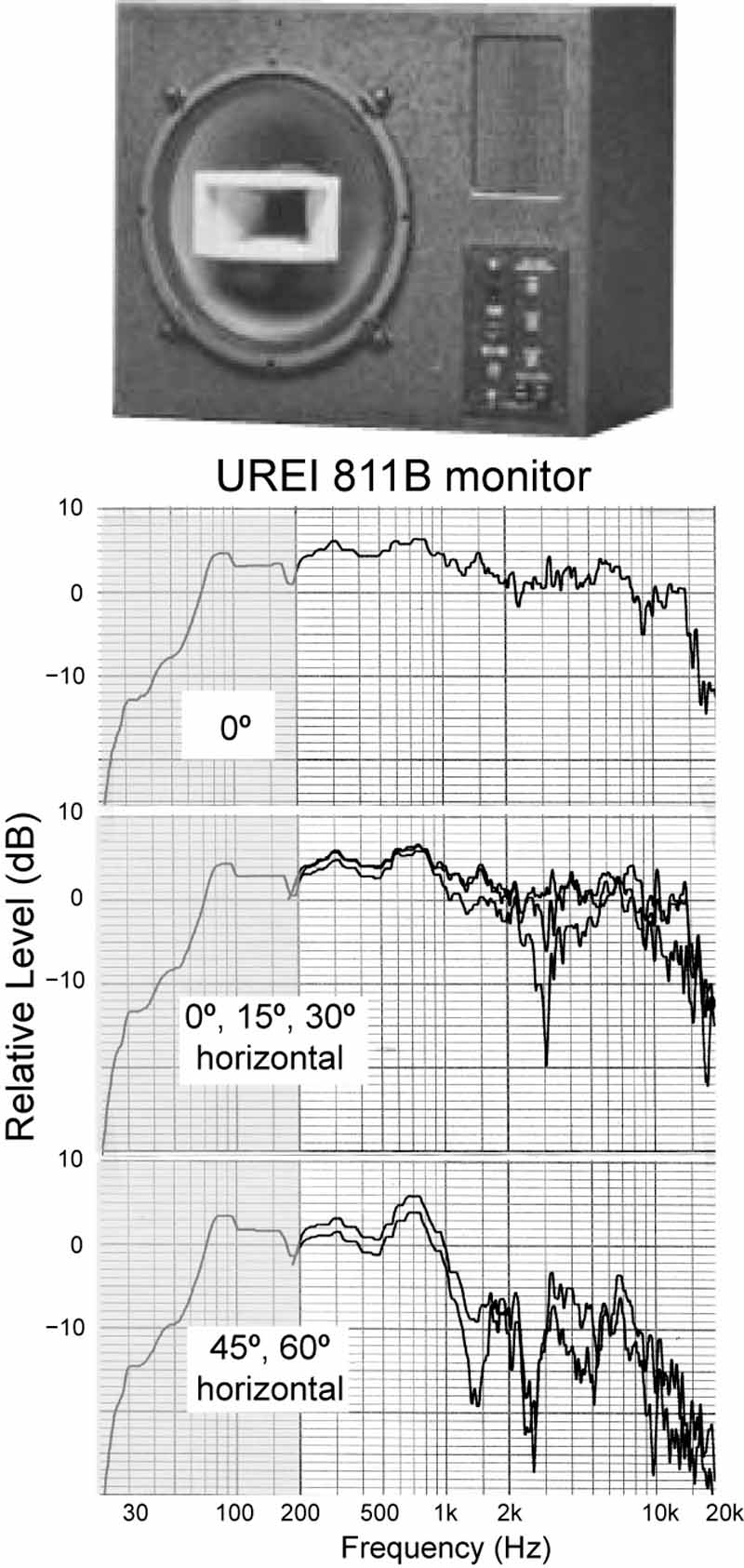 Early on, I recognized one possible contributing factor, based on the performance of some of the popular monitor loudspeakers. Most of them won no prizes for their on-axis performances, but off axis they were even worse; some truly awful. If these off-axis sounds were allowed to reach listeners, the sound quality could not be good. The UREI 811B (shown here) was a favorite around the time the “dead end” control room emerged. Here is proof of a purely electro-acoustical reason to fill the front half of a control room with fiberglass. The 45°, 60° curves describe the potential laterally reflected sounds. There were other real and imagined justifications as well. In our double-blind listening tests at the time this loudspeaker had a strong “personality” and established a new low in sound quality ratings. One has to wonder what effect it had on mixes!
