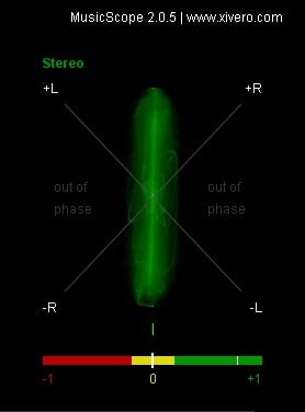 MusicScope Analysis of John Williams Jurassic Park Theme recording with low pass filter applied at 200hz. Indicates significant stereo content below 200hz.