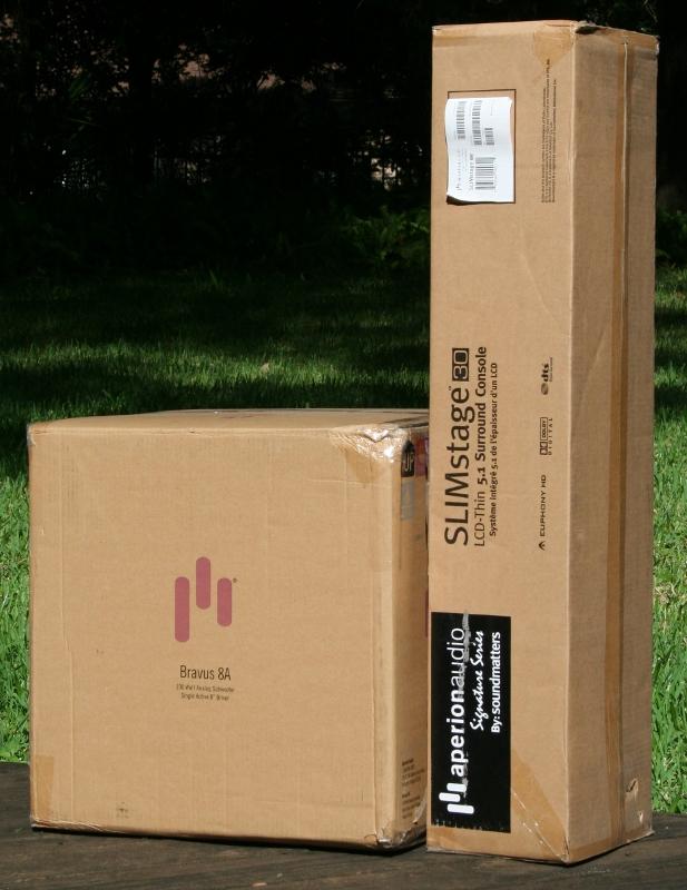 boxesI've received a lot of gear in a lot of different packaging but rarely have I seen anything as well packed as the Soundmatters SLIMstage30. The surroundbar is double boxed with a full layer of foam all the way around it and encased in a canvas bag. There are four unlabeled boxes that contain such accessories as cables, power supply, remote, and wall mounts. All of this is packaged so tightly and so securely that I have to believe that somebody spent more than a few hours on CAD working it out. The packing on the SLIMstage30 was truly impressive.