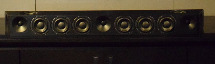 Nicknamed the "bazooka" by the Audioholics crew, the Sennheiser Ambeo is a brick of a soundbar with all its guts and glory displayed. No petite, refined solution here, but depending on the situation that’s exactly how we want it! The Ambeo does not come with a separate subwoofer, but instead, it incorporates 8 midbass drivers to handle the mids and low-level sounds without a sub. Almost as tall as it is deep the Ambeo won’t win any points for subtle integration into a room, but if you’re looking for pure unadulterated sound this is the soundbar for you. The auto setup uses the reflection of sound through your room without using DSP. The calibration software will not only setup front and side channels but rear sound and FOUR overhead channels as well. Sennheizer says this soundbar works best in a room that is roughly square, is a maximum of 26 feet by 26 feet and has a 12-foot ceiling or less. In addition, in order to hear the rear channels the room has to have a back wall.