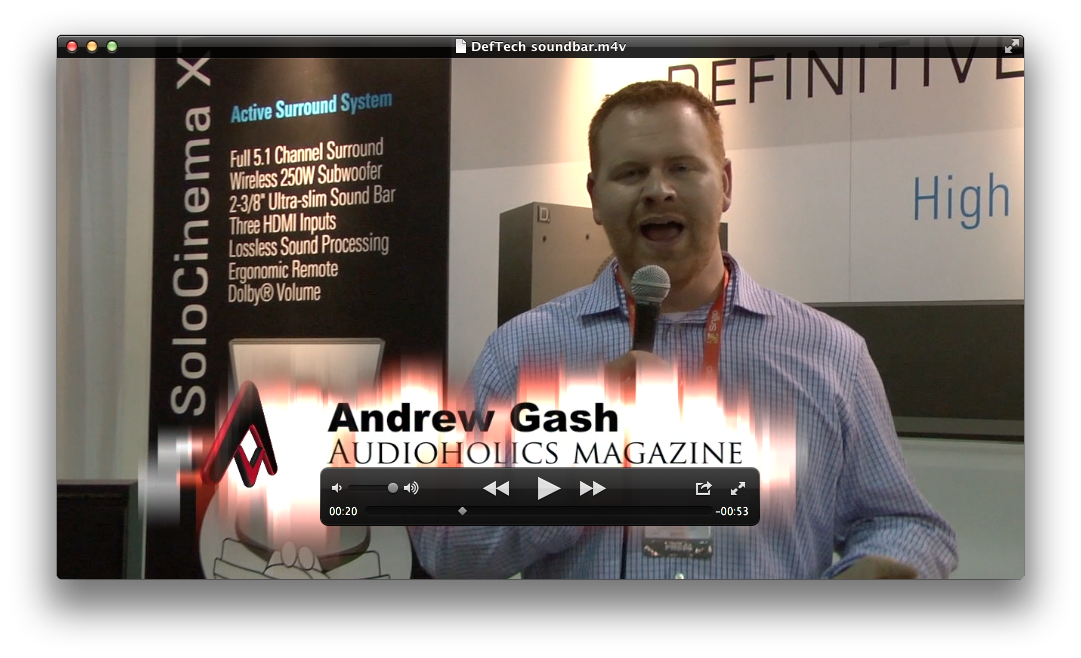 We got to take a look (and listen) to Definitive Technology's new SoloCinema XT Soundbar. It's a fully active system - a full 5.1 channel bar and comes with a 250W wireless subwoofer. It's an ultra slim design, has 3 HDMI inputs, analogue and digital audio inputs and 1 HDMI output. Now, across the front of the physical sound bar there are three MTM (mid-tweeter-mid) speakers, and they use DSP to both increase the front soundstage and also to create the "discrete" surround sound effects channels you hear.