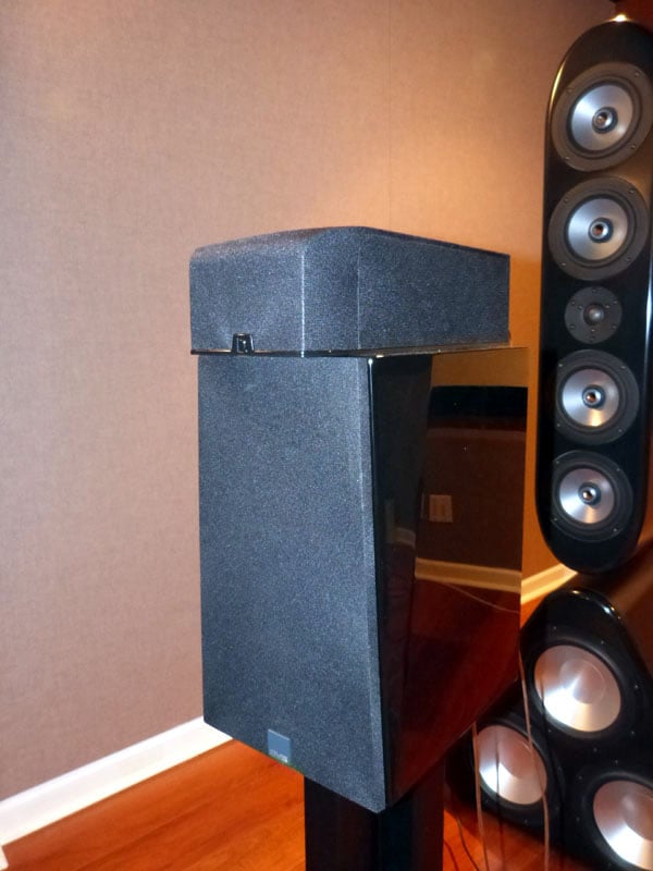 The grille is removable only if you unscrew the two screws towards the bottom front of the speaker. Once removed, you can see Definitive did put some thought into reducing diffraction caused by the recessed baffle, while also controlling dispersion by surrounding the driver in a thick foam pad. The idea here is to limit lateral dispersion so that the sound projects up to the ceiling which is a design goal of such a speaker per Dolby.
