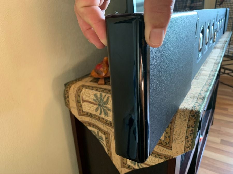 The cabinet is solid and is made of MDF with internal bracing and sealed separate internal chambers for left, center, and right channels. The end caps are MDF covered in high gloss black paint. Primarily thanks to the MDF enclosure, the Ultra-3 weighs in at a respectable 12.5lbs (63" wide) to 9.5lbs (48"). The black grille is magnetic for easy attachment and removal. In this case, where the goal is to blend in with its environment, I think the grille looked better on.