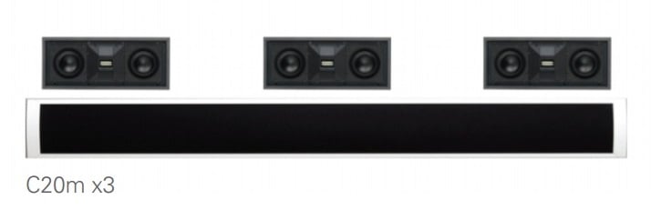 The C20m x3 is a 4-ohm model designed to provide LCR playback with a frequency response of 35Hz - 20kHz +/- 2dB and a peak sensitivity of 92 dB and 93 dB, respectively. The same MTM driver topology from the C20mx2 is employed for all three channels.
