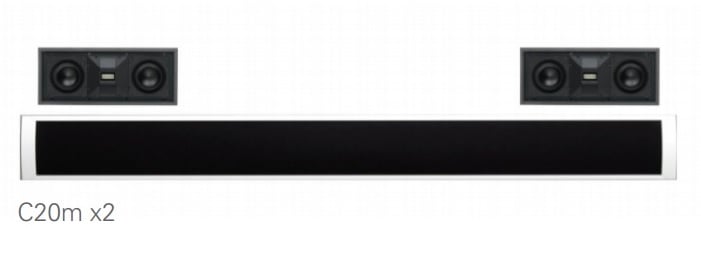 The C20m x2 4-ohm Superbar is designed to produce a stereo playback configuration with a 40Hz - 20kHz +/- 2dB frequency response and 90 dB sensitivity. Notice the horizontal MTM driver topology of each speaker.