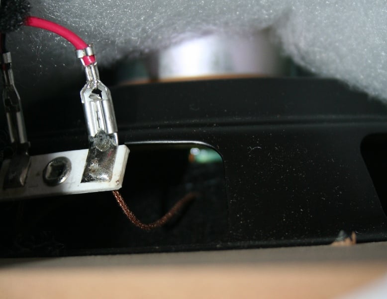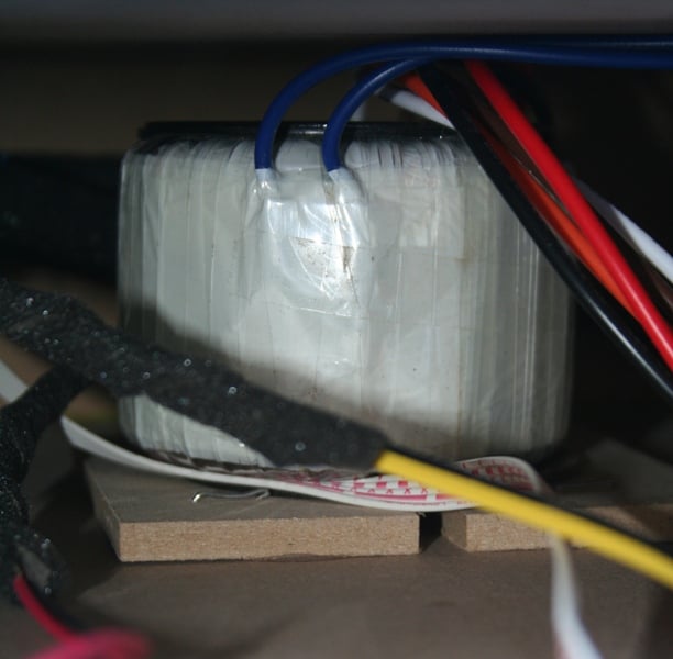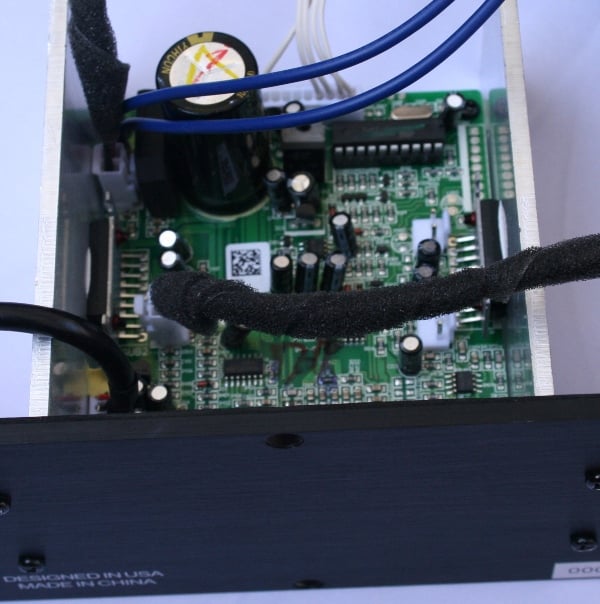 We opened up the back of the ZVOX IncrediBase575 by removing the amp. It was really the only part of the unit that we could get access to. We couldn't get the grills off without risking damaging the unit. Inside, we could clearly see the backs of the 6.5" woofers and the back of the box that housed the front-firing drivers. The front firing drivers were enclosed in their own area and inaccessible. The woofers, which were clearly visible, had stamped baskets. There was a bit of polyfil in the box between the top of the box and the back of the woofers.The wiring to the drivers was wrapped in velvet tape to prevent any noise from rubbing or vibration. Their was a small toroidal transformer mounted in the center of the cabinet. The cabinet was constructed out of braced 1/2" MDF. The bracing of this box is particularly important since not only is it proving inertness to the box but also support for the display that is meant to be placed on top.