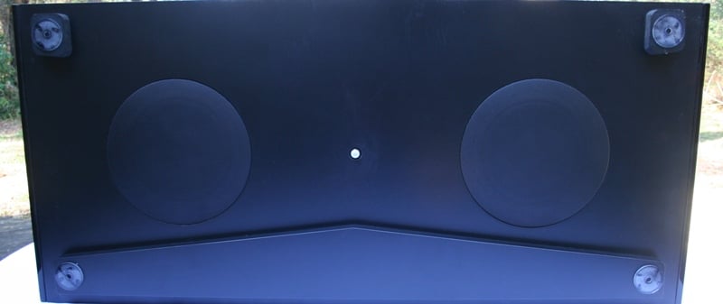 Around the back you'll find two stereo analogue RCA inputs and one subwoofer output. There is also the IncrediBase575HSD which has the same specs but adds digital connections and a few smaller models with similar analogue inputs. There is a slot-style port on the back with four rubber feet on the bottom. The front has a (seemingly) non-removable grill. Behind the grill are five, 3.5" drivers. They are positioned with three in the center and one near the edges of the box. On the bottom of the box is two downfiring 6.5" woofers protected by a metal mesh grill to provide subwoofer duties. The box itself is large and bulky but not overly heavy. While it feels sturdy, it isn't like you'll need to invite a friend over to move it. Most of the box is wrapped in flat black vinyl with the two sides in gloss black. While the black finish should meld well into a dark room, the vinyl seemed easy to mar and slight abrasions were fairly evident on close inspection. For this reason, when you are placing your display on top, we recommend you set it down rather than place it and slide to the correct location.