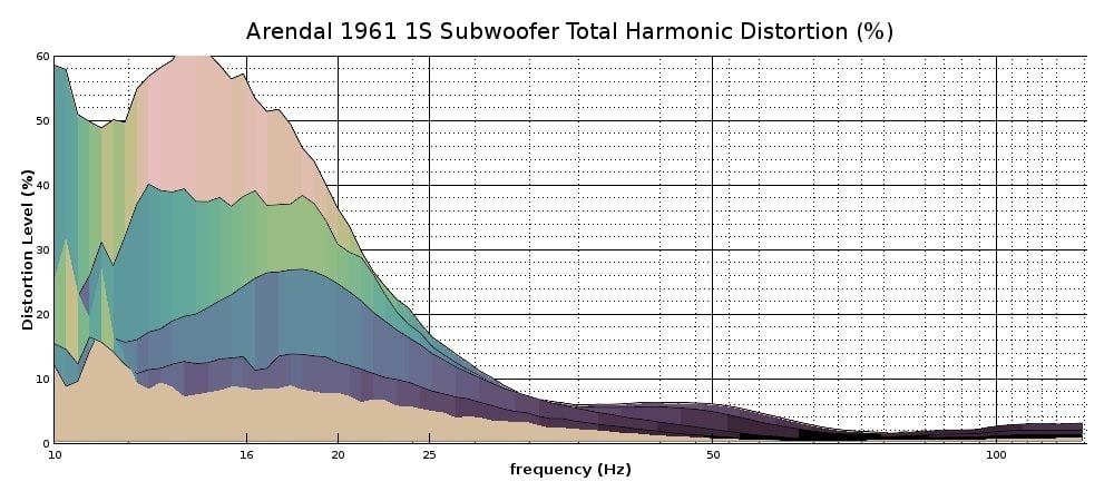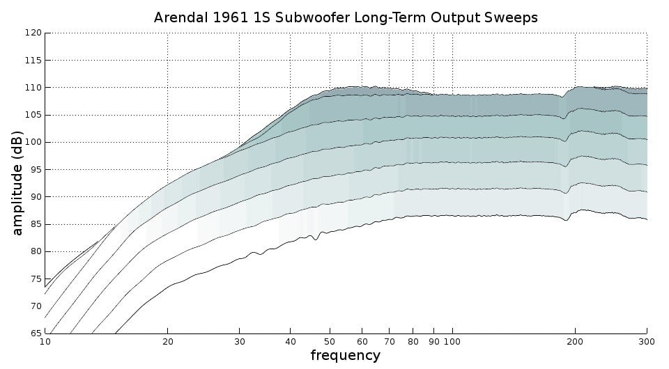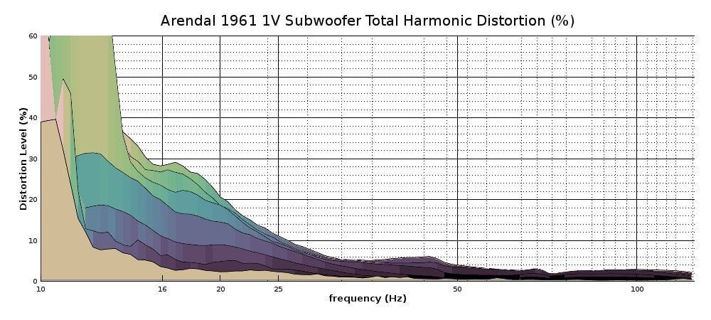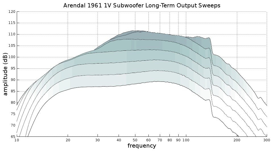 The above graphs show the corresponding total harmonic distortion to the long-term output graphs. Essentially, they depict how linear the subwoofer remains for the corresponding drive level seen in the long-term sweeps. The quantity being measured is how much of the subwoofer’s output is distortion and is shown here as a percentage. The 1961 subwoofers turn in an excellent showing here. At nominal levels, harmonic distortion is extremely low, and can’t really be made to exceed 10% until near 10Hz. Crank things up, and distortion rises, but only in deep bass frequencies. However, the distortion profile remains very good, and the subs just can’t be pushed into a lot of distortion above 30Hz even at maximum drive levels. One interesting thing to see is how the 1V keeps a lid on being completely overdriven until well below its port tuning frequency where there is very little output at all. In most subs distortion skyrockets at around port tuning, at which point output is going down but is not completely gone. This indicates that the 1961 1V is a bit better behaved than most ported subs. The 1S shows a very typical sealed subwoofer THD graph, although distortion doesn’t really take off until frequencies lower than normal for a sealed design, again indicating this sub is on a tighter leash than most in its class.