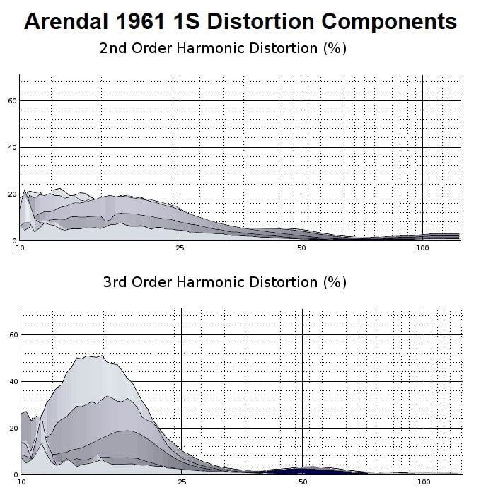 Here we see that the THD comes from a mixture of odd and even order distortions. Some subs mainly have just odd-order distortions as the main ingredient of their THD. The advantage of this distortion profile is that even order is less audible than odd order, so the overall distortion produced by the 1961 subwoofers should be a bit less audible than some others, but it doesn’t matter very much since the subs don’t even produce much distortion until the highest drive levels, and even then it isn’t completely out of control. If I had to guess I would say that the even-order distortion is resulting from the suspension having slightly more tension in one direction rather than inductance since it doesn’t seem to rise at the same rate at all drive levels. Furthermore, these subs have an exceptionally low odd-order distortion level so the nonlinear restrictions on their excursions must be occurring in a partly asymmetric fashion.