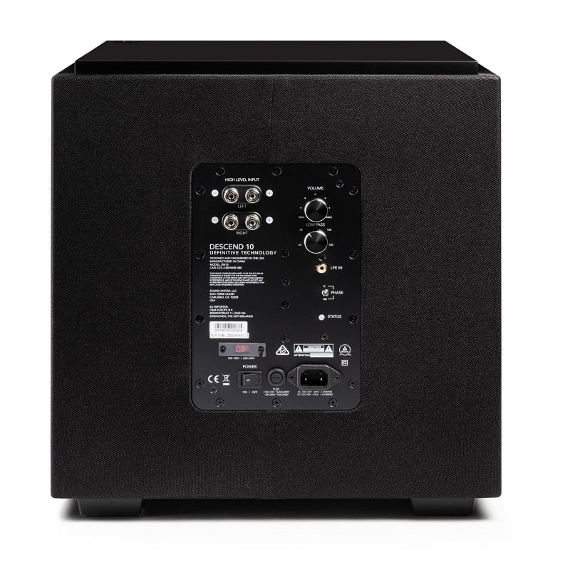 The Definitive Technology Descend DN10 and DN8 are 10-inch and 8-inch subwoofers and are powered by a 500-Watt Class D amplifier matched with custom drivers and the same 3XR dual-radiator architecture found in the 15-and 12-inch models. To ensure the DN10 and DN8 are tuned to the rest of the system and room acoustics, each model features built-in controls to adjust output level, low-pass filter and phase (0/180°).