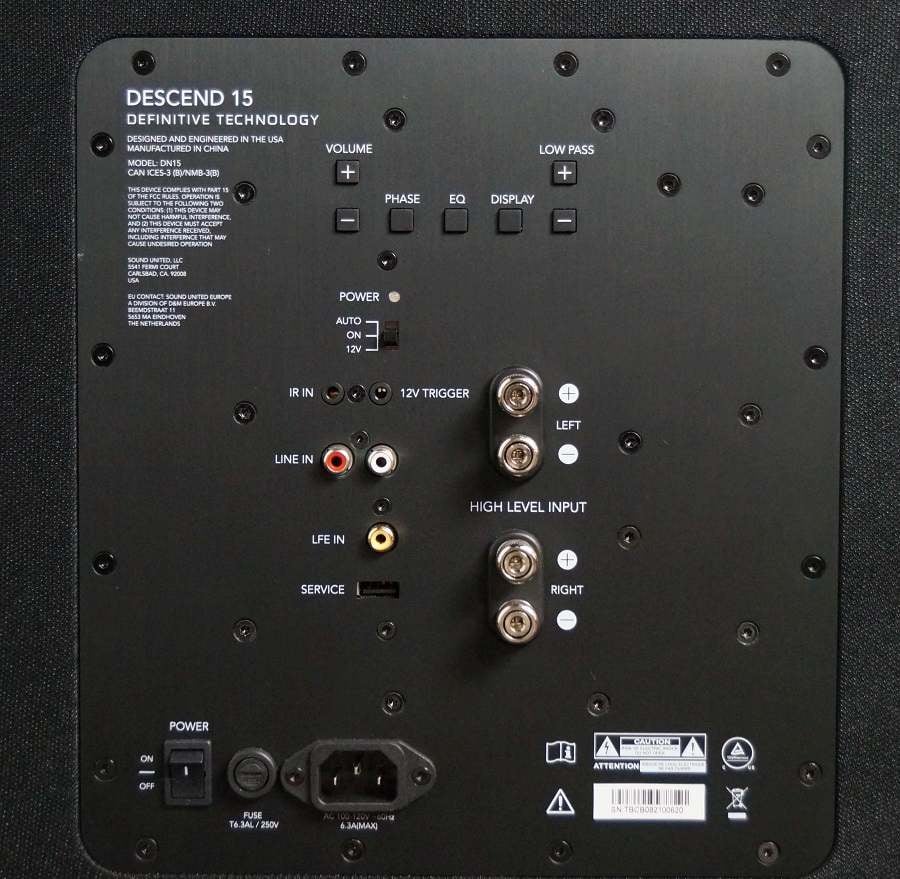 As with many other Definitive Technology products, the DN15 has an attractively minimalist appearance that should go some way towards making its sheer size palatable in a typical room. It leans into its cube dimensions by having all of the edges and corners be hard 90-degree angles. It follows the aesthetic set by Definitive Technology’s bipole speakers by covering the unit in a black fabric. If your speakers are Definitive Technology’s BP9000 series or Dymension series, the DN15 will be a perfect stylistic match. The sub is capped with a satin black top that has an understated Definitive Technology badge inset in the corner. It is basically a big black cube that is softened in appearance by the fabric surface. The non-reflective fabric will help it disappear in a darkened environment. Owners of cats should be made aware that the fabric covering of the DN15 might be an irresistible scratching surface for the felines; cat owners might want to skip this sub unless it will be used in a room cut off from the cat’s space. One interesting visual cue is the LCD display on the front of the sub. It is hidden unless active where it glows through the fabric covering of the sub. It lets the user see the sub’s gain level, phase, and operating mode.
