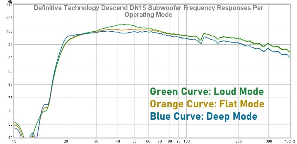 The above graph shows the measured frequency responses for the DN15 subwoofer. Here we see a nicely linear response from 20Hz and above. There is definitely a high-pass filter preventing output below 20Hz because the low-frequency roll-off is so steep. There isn’t much of a high-frequency roll-off, and we are only down by 5dB by 300Hz, so this sub could be crossed over at any frequency that the user could want. That is great news for multi-sub systems that want to use subs with higher crossover frequencies to address room modes. I like how Definitive Technology decided on a clear and specific performance target and hit the bull’s eye. There is not a tremendous difference between the various operating modes. The “Loud” mode gives the user a bit more punch from 40 to 50Hz, and that might give some more oomph to the fundamental frequencies of low-tuned bass drums or electronic bass lines. “Deep” mode gives 20Hz a couple more dB at the expense of the 40-50Hz range, and that would perceptually give more weight to the low-end. “Flat” mode is the middle ground between these. In my listening, the differences between these modes were subtle, so I just left it on flat for most of my listening.