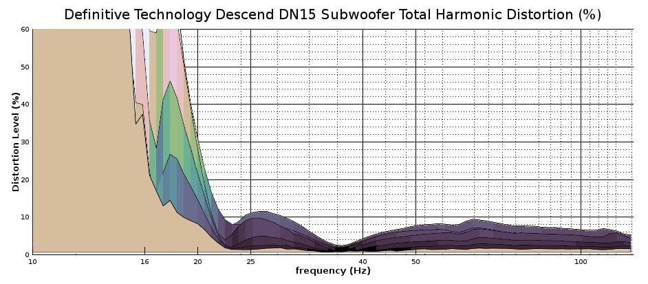 As we saw in the burst testing, the DN15 holds its composure well, even when pushed to full throttle. Yes, there is a lot of distortion below 20Hz, but there isn’t much output in that range, so that doesn’t matter. What matters is distortion within its operational range, but it stays well-controlled above 20Hz. Distortion can barely break 10% THD even at the maximum drive level. This sub just does not want to produce any sound that isn’t in the source signal, and it maintains its fidelity no matter how hard it is pushed. I still think there is room for more amplification. If Definitive Technology did add another 500 watts, I wouldn’t guess we would see a major boost in distortion on top of the levels seen here, only a minor increase. I think it would be worth the additional headroom. However, I should say I never really topped out its headroom in my own listening.