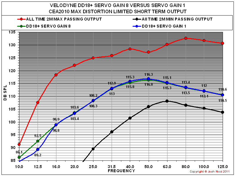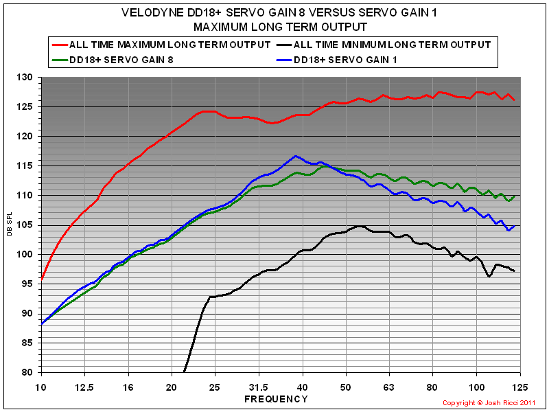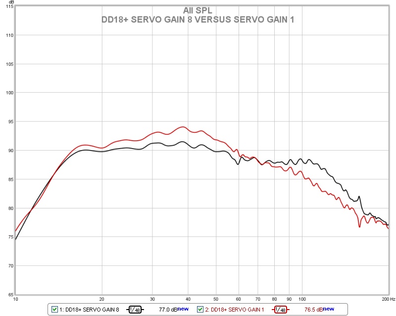 Looking at the maximum long term output achieved for both the minimum and maximum servo gain settings shows that the output headroom is virtually identical below 30Hz. There appears to be some difference above that point but this is again probably deceptive because the response shapes start out differently. The 2 curves would likely converge further if an even higher input level were used.