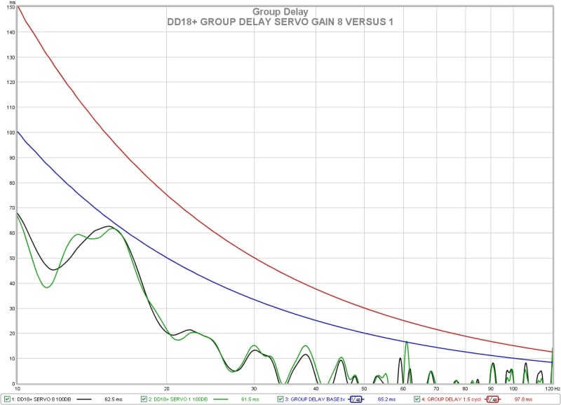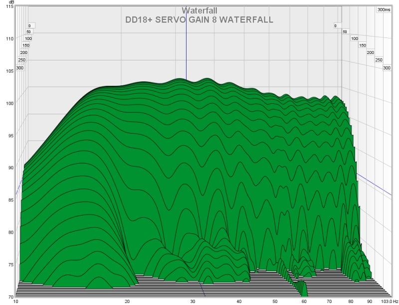 The response of the DD18+ in the time domain is rather uneventful and about as expected. There is clean decay across the full range until about 16Hz where there is a moderate increase due to the boost EQ being employed to extend the response and the corner of the high pass filter. Still it never breaks 1 cycle of delay even below 20Hz. There is negligible difference in this performance metric whether the servo gain is set to minimum or maximum.