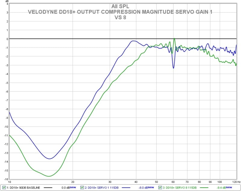 Above we have another way of looking at the results from the output compression test. This shows only the amount of signal compression occurring during the nominally 115dB sweep level for both the minimum and maximum servo gain settings. The lowest servo gain setting appears to have advantage here but this is deceptive due to the flatter response of the highest servo gain setting producing higher output at the frequency extremes at the same basic sweep level. This is because the sweep level is referenced to 50Hz. In reality the difference is very small to nil.