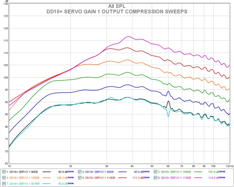 The maximum long term output compression test for the DD18+ with the servo gain set to minimum and maximum both are presented above. Overall despite the response shape differences there is not much difference. Compression and output limiting kicks in first at about 16Hz where the response is being boosted the most and expands progressively from there as the output is increased and the subwoofer reaches the maximum output level that it can produce as configured. The output does not start compressing notably until the 105db sweep level. By the 115dB sweep level the deep bass is being limited heavily everywhere below 30Hz.