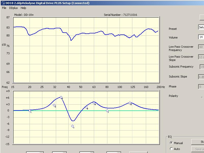 For all of the listening sessions the Velodyne DD18+ was placed in the front right corner of the room firing into the corner about 4 inches from the walls. This places the subwoofer a little over 4 meters from the primary listening position. I have determined this to be the best available single subwoofer placement in the room for most units. Audyssey was run on the system to allow it to integrate the DD18+, which was then followed by a check and recalibration of the subwoofer and speaker levels prior to the listening sessions. I also had earlier done some in room testing of the EQ capabilities built into the DD18+ which had some interesting results that we will get into later in the review. I did not end up using the built in EQ, instead manually providing some extra EQ to help tame a severe peak at 45Hz due to the room acoustics that affects every subwoofer placed in the room. Audyssey did not provide enough correction alone to tame it. The DD18+ settings were as follows for all of the listening session: Low pass filter disabled, rumble filter set to 15Hz with a 6dB octave roll off which allows the deepest extension possible, night mode off and servo gain at its highest setting of 8.