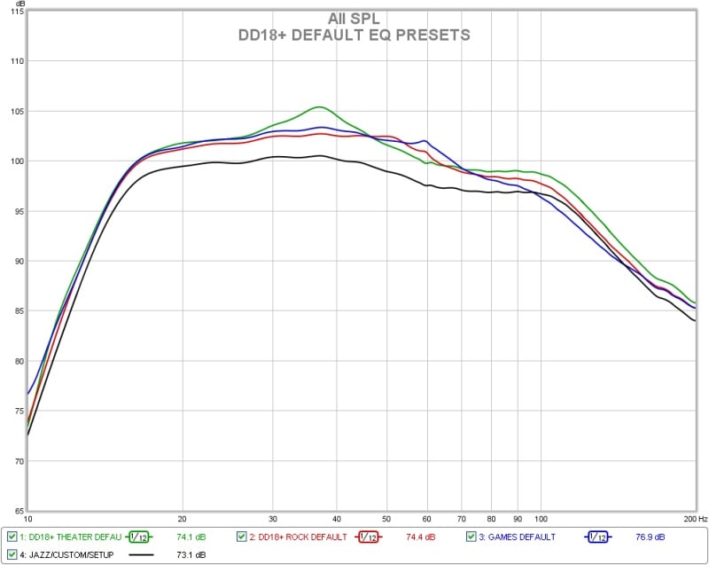 Above is the basic response of the preset EQ curves available from the factory. Most of them appear to add an overall signal boost. The theater setting adds a slight peak near 35Hz which seems to have a higher Q than one would expect. The Games preset adds a little boost to the 60Hz region.