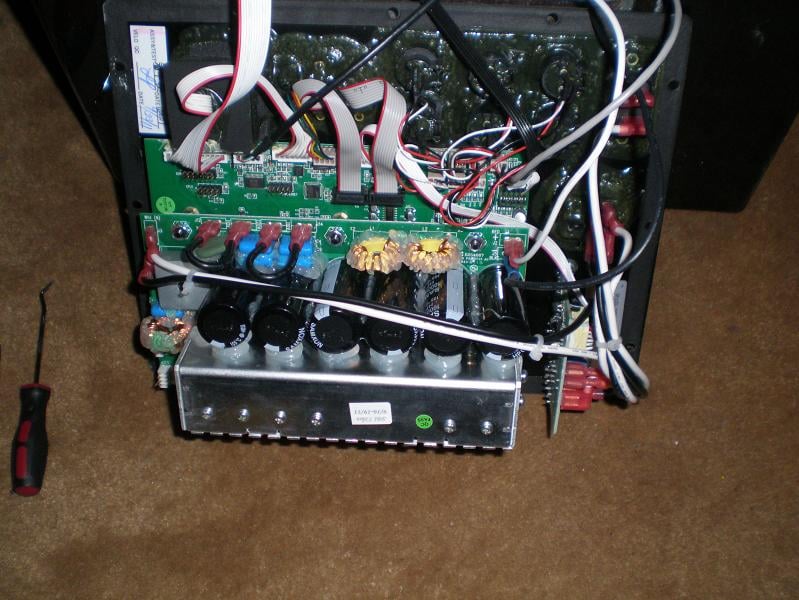 The amplifier itself appears to be of similar high quality and connects to the front panel control unit via a ribbon cable. Six large reserve capacitors were in evidence on the top circuit board as was a small aluminum heat sink which indicates that this is the power section. Another larger circuit board is mounted below the power section. During testing and use the amplifier face never got much more than warm to the touch implying that it is a very efficient design. Also the amplifier contains a simply staggering amount of input and output connection possibilities. Everything from balanced XLR ins and outs, to 12v trigger, to speaker level inputs, unbalanced RCA, serial ports and even an Ethernet port. There is even a USB port on the front panel. No one can accuse Velodyne of limiting your options that is for sure.