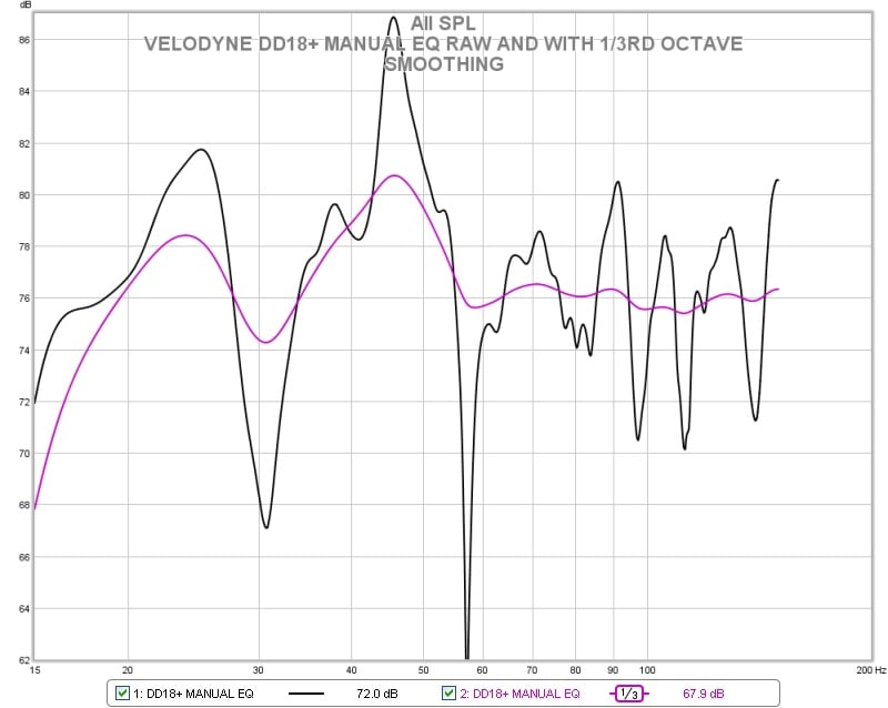 The above 2 charts show the measured response of the DD18+ with some manual equalization applied. The top graph in the bottom picture is frequency response as reported inside of the Velodyne software. It is showing a response variation of +/-2.5dB, or a 5dB total window from 15-200Hz. Any audio fanatic would be proud to have that response. The picture above the Velodyne chart is what my reference measurement system reported the DD18+ response as. I have scaled the 2 graphs as closely as possible for comparison. The black line is the raw measurement from the M30 with no smoothing and the pink trace is the same measurement with 1/3rd octave smoothing. Looks rather different eh? The black trace is +/-13.4dB from 15-150Hz. Even with 1/3rd octave smoothing the pink trace is still +/-6.4dB over that range. I had thought that adding the smoothing would better reconcile the two but it still doesn’t match up that well. Even more curious is the fact that many of the main features from the two measurements do not seem to match up. The Velodyne chart indicates a dip at 45Hz instead of the obvious peak. Again at 30Hz there is a bulge in output instead of a dip. Down below 20Hz the Velodyne software indicates a rising response, but my personal rig indicates a large drop off. Very odd indeed. I’m not really sure what to make of this. It almost seems as if the response as reported on the graph inside of the Velodyne software is offset ½ of an octave. Again both microphones were in the same position within ½” of each other. Certainly there can be differences attributable to the different test signals used and the way the data is presented but these seen here are rather large. If you do use the internal EQ of the DD+ series the manual method is by far the best option in my estimation.