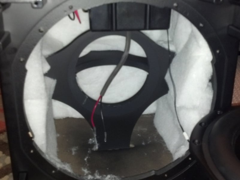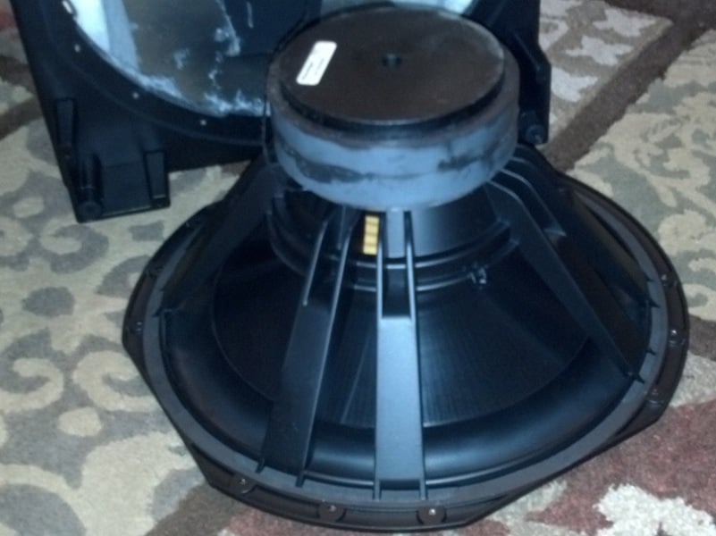 Removing the 15” driver from the 1500X revealed it to be a well engineered if not massively powerful unit. The frame is a good looking cast aluminum design with under spider venting and with the flange cut into a square pattern. The driver mounts with a total of 12 large Allen head screws and is flush mounted into the baffle. The cone of the driver is a lightweight polypropylene which is suspended by a large rubber half roll surround and what looks like a pair of 6” diameter spiders. The motor is built with a pair of stacked ferrite magnets that are about 6” in diameter and ¾” thick. The top and bottom plates both appear to be about 8mm in thickness and the back plate has a small 0.5” diameter pole vent. The voice coil appears to be 2” diameter. When the driver was removed from the cabinet I noticed that there was a secondary small black wire that led to the drivers frame and went in under the spider landing. It turns out that this is a thermal sensing system which helps monitor and protect the driver from excessive heat buildup in the voice coil. As far as I know this system never came into effect while the 1500X was in my possession and I definitely was not delicate with it at times. Either that or it is very subtle in operation.