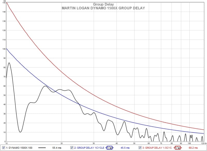 Group delay measurements for the 1500X indicate that there is some energy delay centered at about 20Hz corresponding with the boost equalization and high pass filtering used. The group delay is well mannered down to 30Hz where it starts to increase until it just barely exceeds 1 cycle of delay from 19-25Hz. Still at such deep frequencies and with the group delay just barely breaking 1 cycle it is doubtful that this is of any audible consequence.