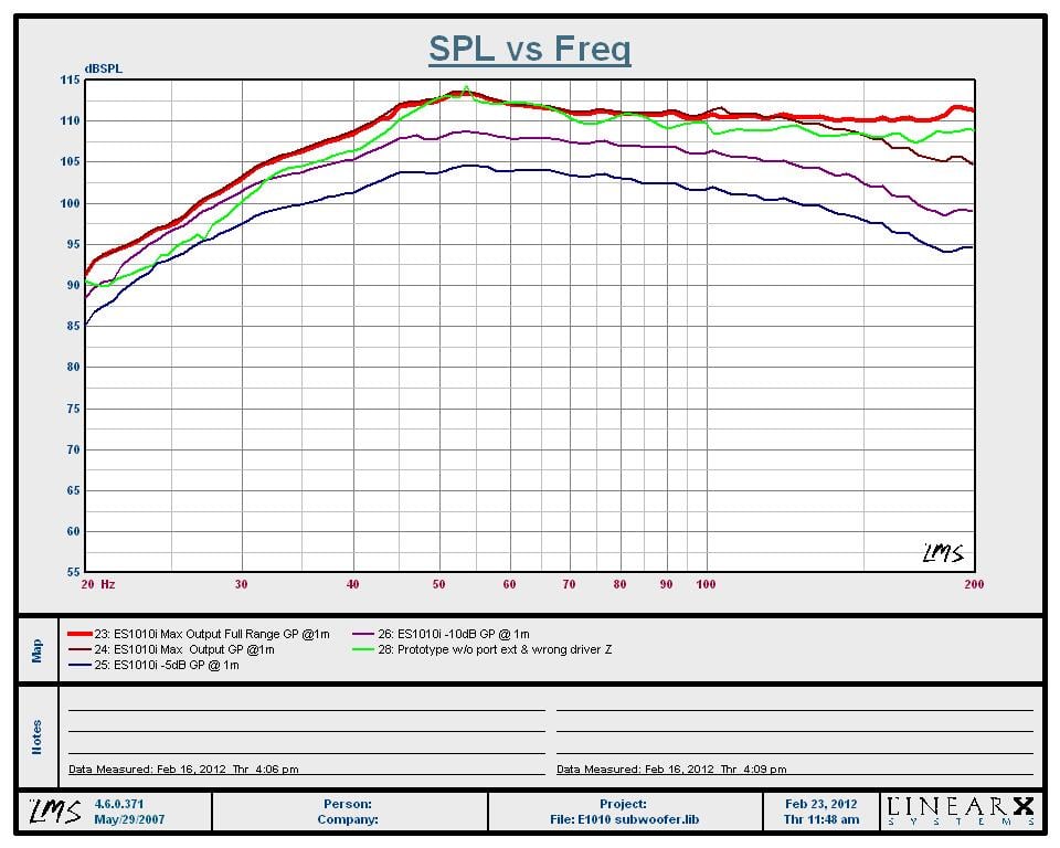 The ES1010i review sample I initially reviewed accidentally had a 4-ohm driver installed from their ES10i subwoofer model which lowered the overall impedance the amplifier saw to 2.7-ohms instead of 4-ohms (by running two 8 ohm drivers in parallel). This put more strain on the amplifier and thus dropped the overall output almost 3dB below 40 Hz as you can see in the green trace. EMP has since then sent me the correct driver to make the correction. They also have increased the port tube length on new products shipping to increase usable bass output below 40Hz as you can see in the red trace.