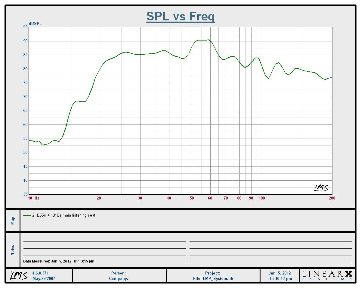 In-Room Frequency Response of (2) ES1010i subwoofers + E55ti Towers at the Listening Position