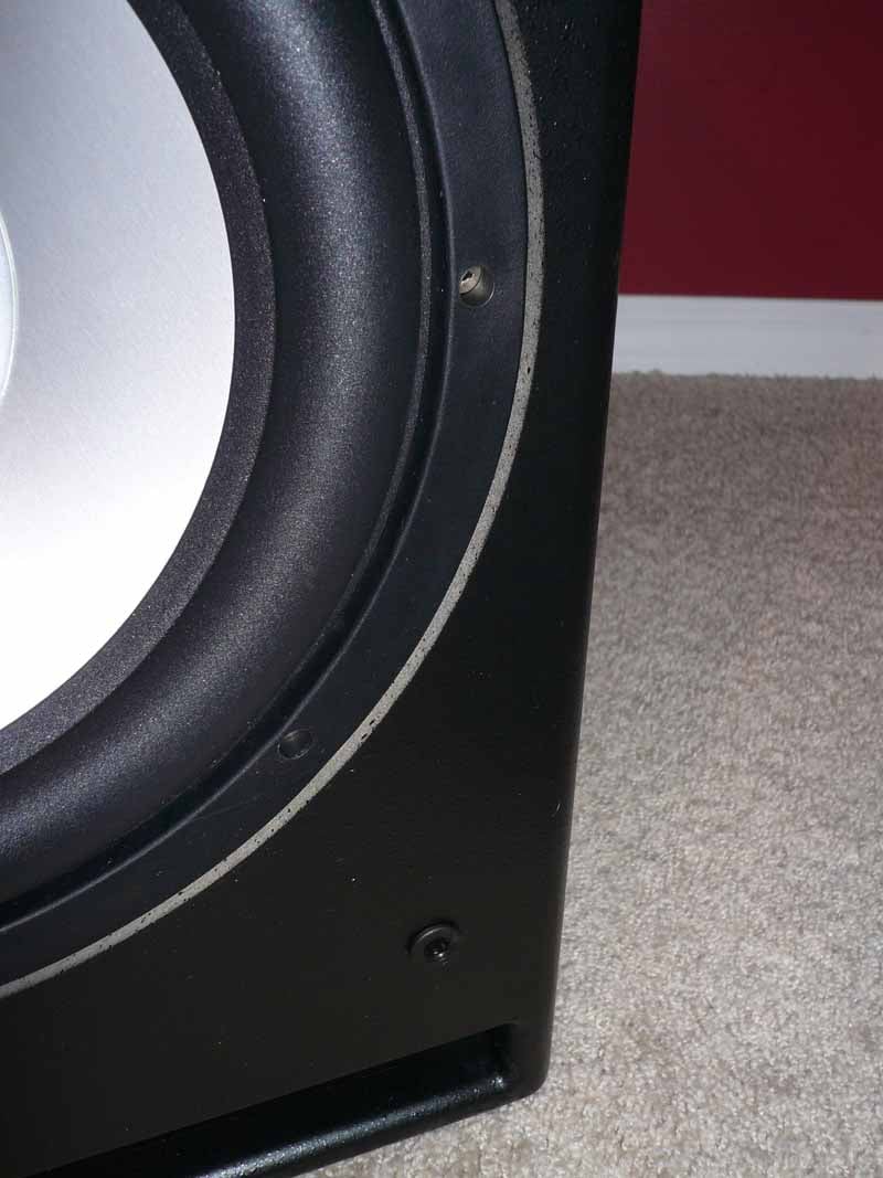The Sentinel uses a 12” diameter aluminum driver powered by a 600 Watt amplifier. Both the driver and the amplifier are exclusive designs built specifically for Epik. The driver is flush-mounted to the front baffle, but I found the fit and finish to be a little bit lacking. The driver itself has a fairly thick, rubber trim into which the 8 mounting screws are drilled. One can easily see the small gap between the MDF cabinet and the rubber trim of the driver. This internal portion of the cabinet is not painted or finished in any way, so it looks just a little bit cheap; as though the hole was cut and the driver was just plopped into the hole. A simple bit of extra trim to cover the gap would make the Sentinel look more "high end". Of course, with the grill in place, none of this is visible.