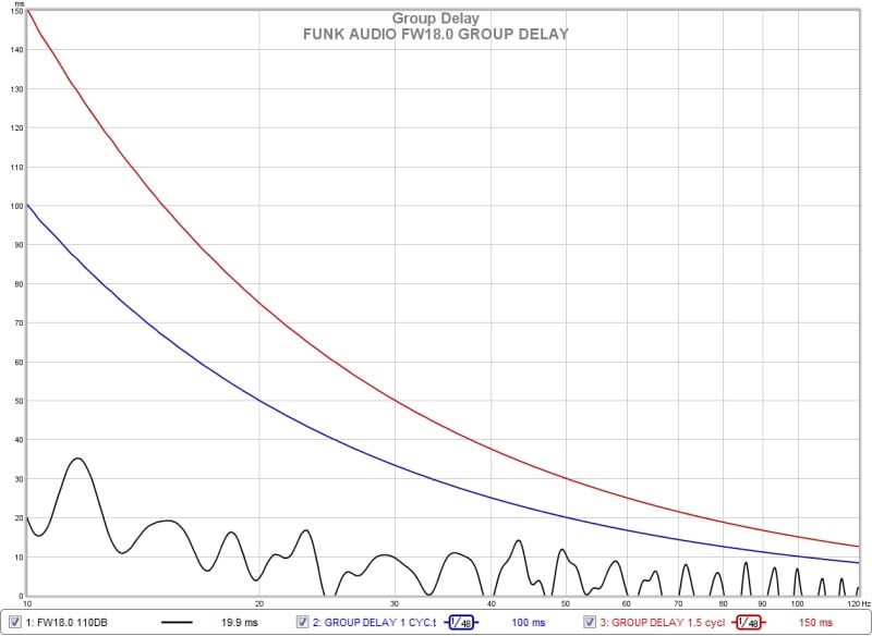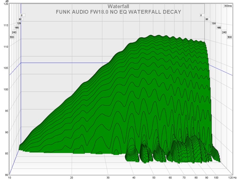 Group delay measurements for the FW18.0 showed no excess energy at any frequency and nothing that could be considered of note. Even with some of the more heavily equalized presets the group delay never got close to even 1 cycle of delay. Likewise the waterfall decay measurements show a quick and rapid loss of 25 to 30dB of energy by 100ms out which is what I typically look for.