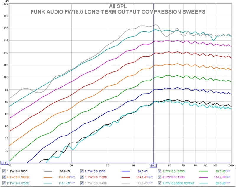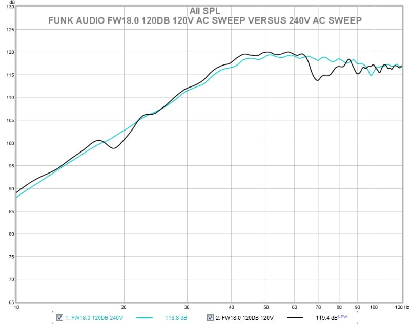 Funk Audio FW18.0: Long Term Output Sweeps 120v AC versus 240v AC Line