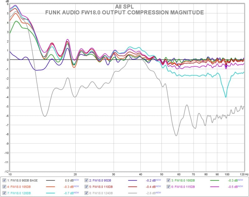 Looking at only the amount of compression occurring in the output of the FW18.0 it can be seen that there is basically no compression at all through the 115dB sweep where it is less than 1dB! Even with the 120dB sweep it still exhibits very little compression of the output with less than 2dB in the upper bass except for a slight blip at 100Hz which is due to the amplifier limiting the output. This drive level is right at the edge of the output limits for the platform as a further increase results in very little extra output and tons of compression across the entire bandwidth. Considering the output levels being produced in the upper bass and the amount of current being delivered into the drivers voice coil this is an impressive showing.