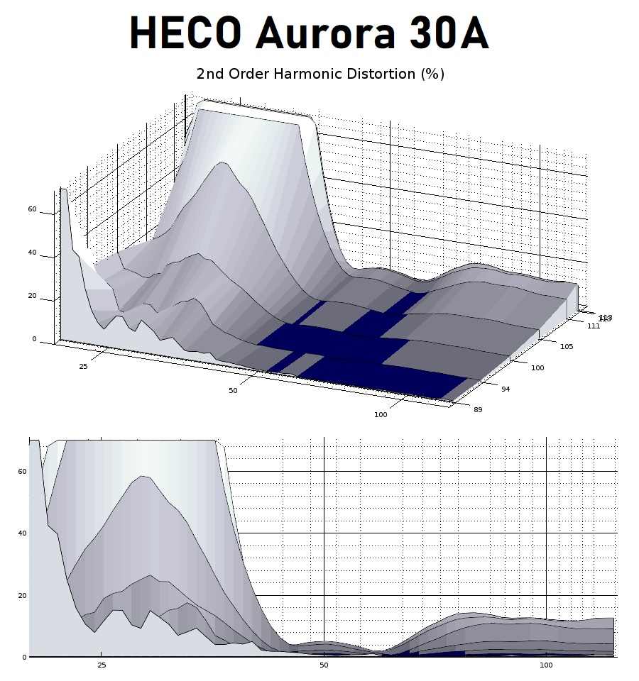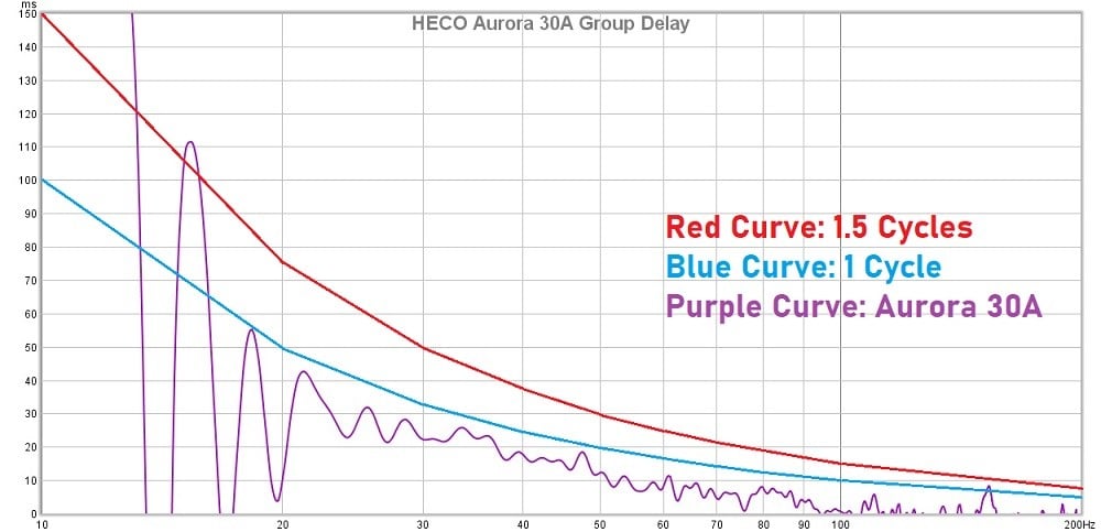 Testing on the HECO Aurora 30A was conducted with the microphone facing the woofer at a 1-meter distance with measurements scaled back to a 2-meter distance by subtracting 6dB. The temperature was recorded at 60F degrees with 90% humidity. The subwoofer’s gain was set to maximum, the phase was set to zero, and the low pass filters were set to maximum.