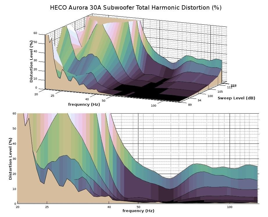 At low levels, the 30A has almost no odd-order distortion products and a mild level of even-order distortion. I would guess that the distortion at these levels is mostly from inductance. A shorting ring might lower that, but the audible difference for such minute amounts of distortion isn’t likely to be worth the cost. Distortion really starts to blow up in the last 10dB, especially in the odd-order harmonics. Here the driver is running into the limits of its linear throw, likely reaching the edges of where the magnetic field exerts control over the voice coil. Below this drive level, the coil is in its happy place, at least above 40Hz. I should say that in this scenario, the sound of the distortion that the 30A produced was unusual and not like any sub I have tested. It modulated the signal to sound almost like a musical instrument effects processor. It’s not exactly something desirable for the purposes of fidelity, but it had an interesting sound.