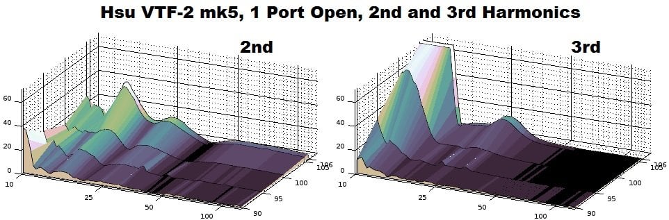 The above graphs are the component harmonics of the total harmonic distortion from the VTF-2 mk5. As with the burst test graphs, the chief offender as the sub gets pushed hard is the odd-order harmonics, 3rd and 5th. The even-order harmonics rise at a steadier rate with increased output, instead of precipitously at the highest drive levels. This behavior is in line with what would be expected from this type of subwoofer.