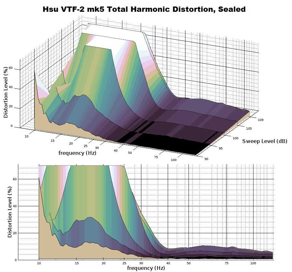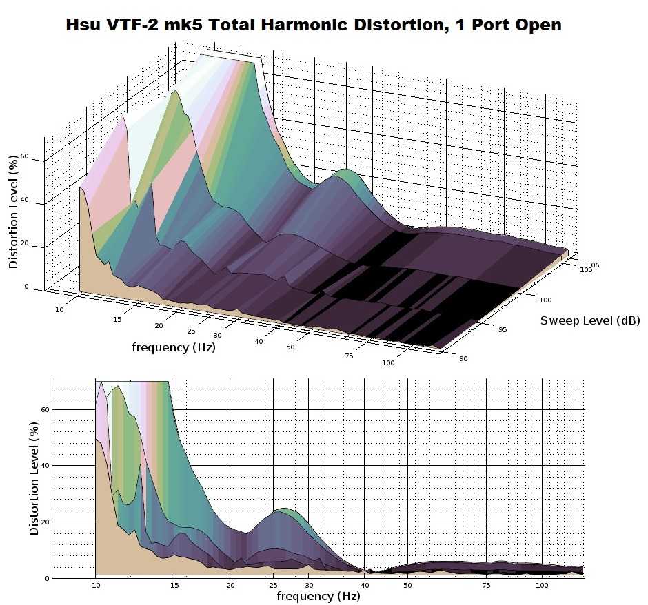 Theory is fun and all, but how well did the VTF-2 mk5 perform? These results are all quite good for a sub with the VTF-2 mk5’s specifications. Distortion is very heavy at frequencies below the tuning point (18 Hz as tested here), but that is expected since it is outside the subwoofer’s intended range of operation. Above the tuning frequency, distortion only becomes significant at the very highest drive levels. Don’t think that just because you can see the distortion in these graphs that they can be heard; much of the distortion through these graphs are 20 to 30 dB beneath the fundamental which is well below audibility (we have an article discussing the audibility of distortion in bass frequencies here). What is apparent is a great deal of care was invested in optimizing the performance of the VTF-2 mk5. Distortion is kept under control for most of its operational range, and it stays clean even at very loud levels.