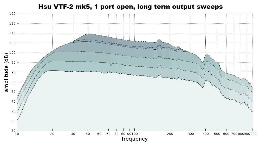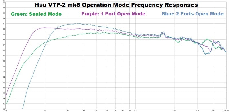 From the frequency response sweeps we see that the VTF-2 mk5 is impressively flat, especially in 1 Port Open mode, easily meeting Hsu’s claimed +/- 2 dB from 18 to 200 Hz response. 2 Ports Open mode sees a rise at the lower end of its response with the Q Control at 0.7, but when turned to 0.3, it also falls well into Hsu’s claimed response of +/- 2 dB from 22 Hz to 200 Hz. Even the sealed mode holds an impressively flat response down to 20 Hz, although the shape of the response is very different from the ported modes. In any mode the VTF-2 mk5 has enough linear upper frequency bandwidth to be used well above 200 Hz if so desired.