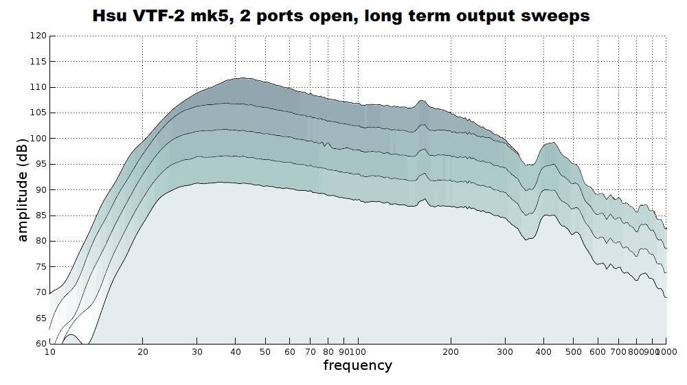 Testing for long-term output compression was done by first conducting a sweep tone where 50 Hz hit 90 dB with the subwoofer 2 m from the microphone. We then conduct further 20 second sweeps by raising the gain by 5 dB until no more output could be rung out of the subwoofer. One slight oddity we see is that the sealed mode has a tad more mid bass headroom, which is not a result I would have expected. I sent a question what might cause this to the VTF-2’s designer, Dr. Hsu (guess who the company is named after?) He speculated that the woofer’s resonance will be higher in the enclosure with the ports open, and so the impedance in mid bass frequencies will be higher for the ported modes meaning the amplifier would not be able to deliver as much power to the driver versus the sealed mode.