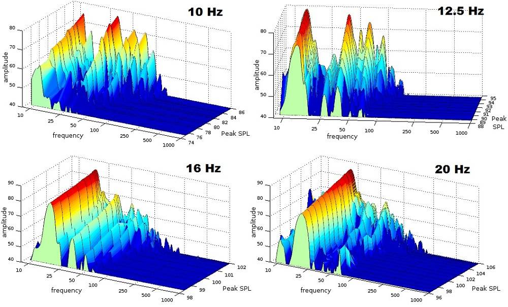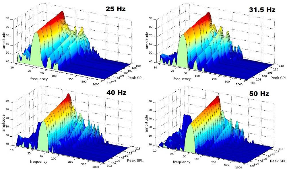 A few interesting but unsurprising results can be seen in these tests. What is seen is pretty much textbook behavior for a subwoofer of this type. As the sub approaches its limits, distortion grows rapidly. A good illustration of how long excursions affect driver behavior can be seen in the 12.5 Hz graph, where we have angled the graph for a better view; odd-order harmonics dominate, which is what is expected when it is reaching past the edge of its linear throw. The stiffening suspension or the reduction of the magnetic field at the outside of the throw is likely the culprit, since those affect both directions of travel. Compare that to the upper frequency measurements where the even-order harmonics are dominant; the excursion does not reach far, so other elements becomes the cause of the leading nonlinearities, elements which are only affecting one side of the woofer’s travel.