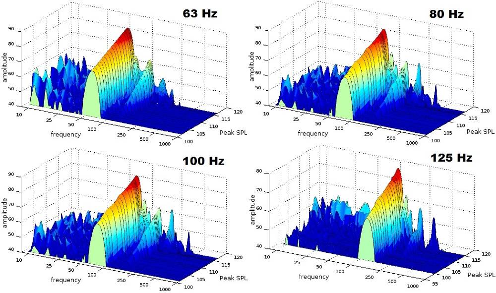 The above graphs show the frequency spectrum of the increasing CEA-2010 bursts as reproduced by the VTF-2 mk5. Essentially, it depicts the behavior of the subwoofer reproducing short burst tones at successively louder levels, with each test tone raised by boosting the input gain by 1 dB until either no more output was to be had from the subwoofer or the subwoofer started making too many mechanical stress noises for the tests to be safely continued. The frequency marked above the graphs note the fundamental tone being tested, and this can also usually (but not always) be discerned in the graphs by the horizontal axis frequency point of the “main ridge,” the highest levels on the vertical axis. The noise below the fundamental (that random spikiness to the left of the main ridge) should be ignored. What should be looked at are the smaller ridges to the right of the fundamental. These are the distortion products of the fundamental, and it is here where we see how cleanly the subwoofer handles a given output level. These are mostly harmonics: whole number multiples of the fundamental.