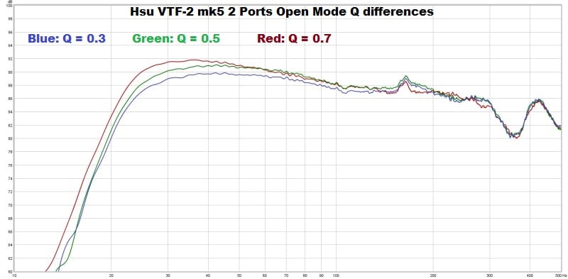 The Q control allows the low end of the VTF-2 mk5 to roll off at a different rate. In addition to adjusting the Q, the user can set the EQ mode switch to roll the low end off at higher frequencies by setting the EQ switch to EQ2 with one port open or all ports sealed; this would be an ‘overdamped’ mode of operation. With a combination of Q settings, port configurations, and EQ mode settings, the low end of the VTF-2 mk5 can be made to have dozens of different response shapes.